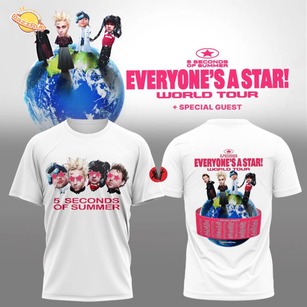 The 5 Seconds Of Summer — “Everyone’s A Star!” T-shirt celebrates individuality and self-expression. Crafted with comfort and style in mind, it inspires fans to embrace their uniqueness. Wearing this shirt is a perfect way to show support for the band while making a bold statement. Get your 5 Seconds Of Summer — “Everyone’s A Star!” T-shirt today!