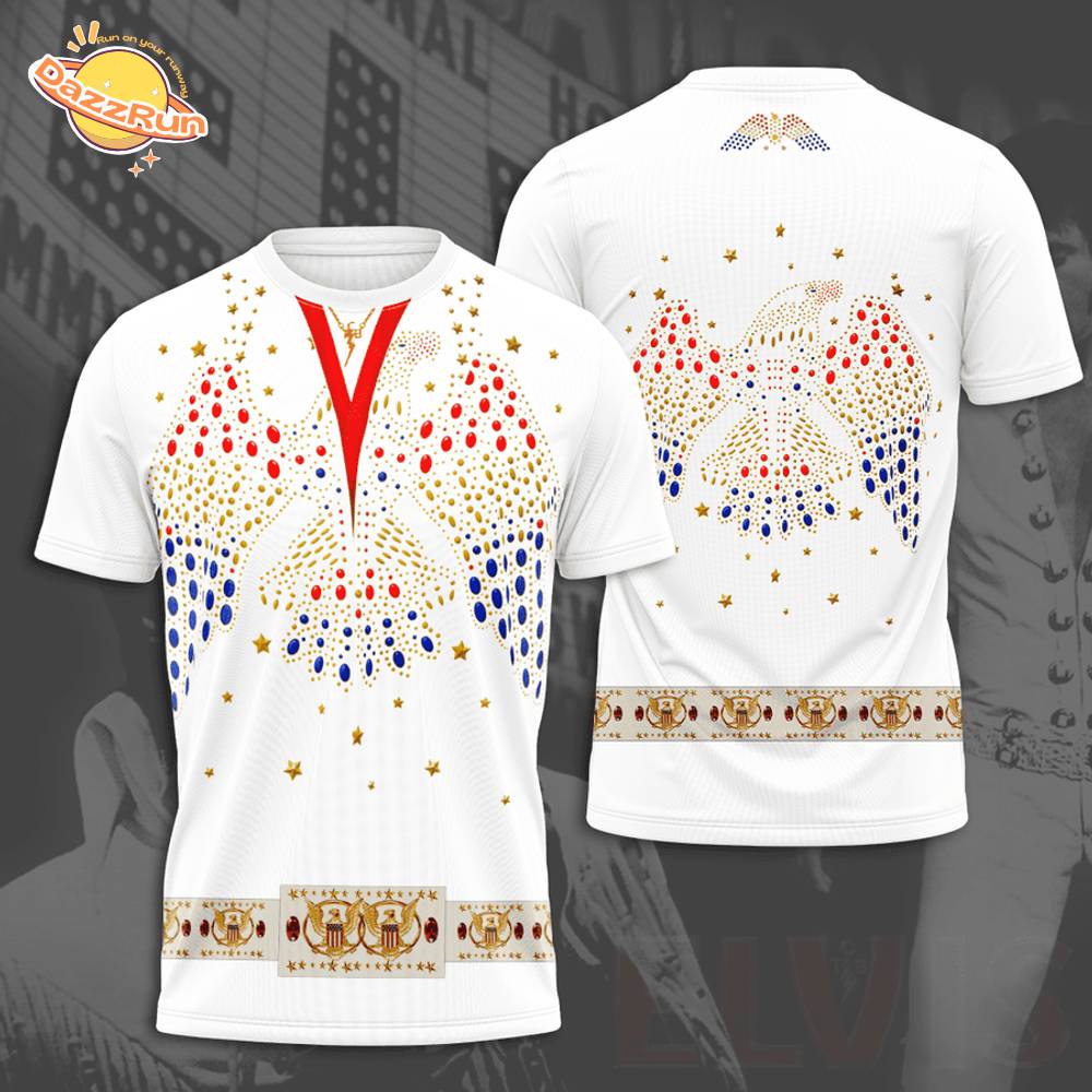 Another notable aspect of the Elvis Presley American Eagle Costume Jersey – White 70s Jumpsuit Style Shirt for Fans is its ability to serve as a conversation starter. The iconic imagery and unique design provoke nostalgia and admiration, making it an excellent icebreaker. Wearing this shirt can lead to engaging discussions about Elvis’s music, his cultural impact, and your personal connection to his legacy. It’s more than just a piece of clothing; it’s a way to share your passion for one of the greatest entertainers of all time.